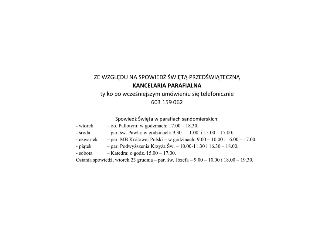 ZE WZGLĘDU NA SPOWIEDŹ ŚWIĘTĄ PRZEDŚWIĄTECZNĄ